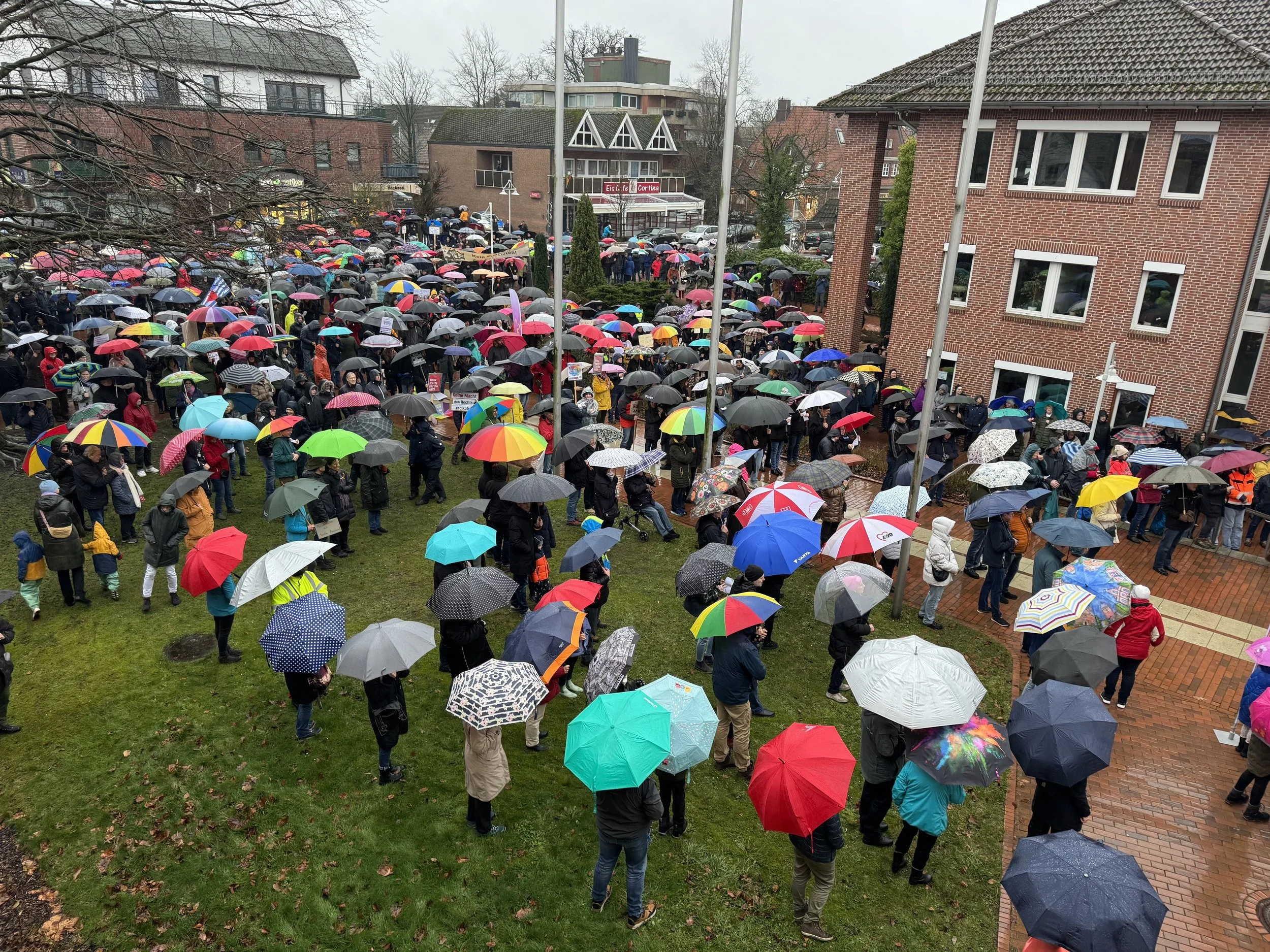Regenschirme prägen am gestrigen Sonntagnachmittag das Bild vor dem Schneverdinger Rathaus. Im Dauerregen setzen rund 800 Menschen ein klares Zeichen gegen Rechtsextremismus. Foto: dh