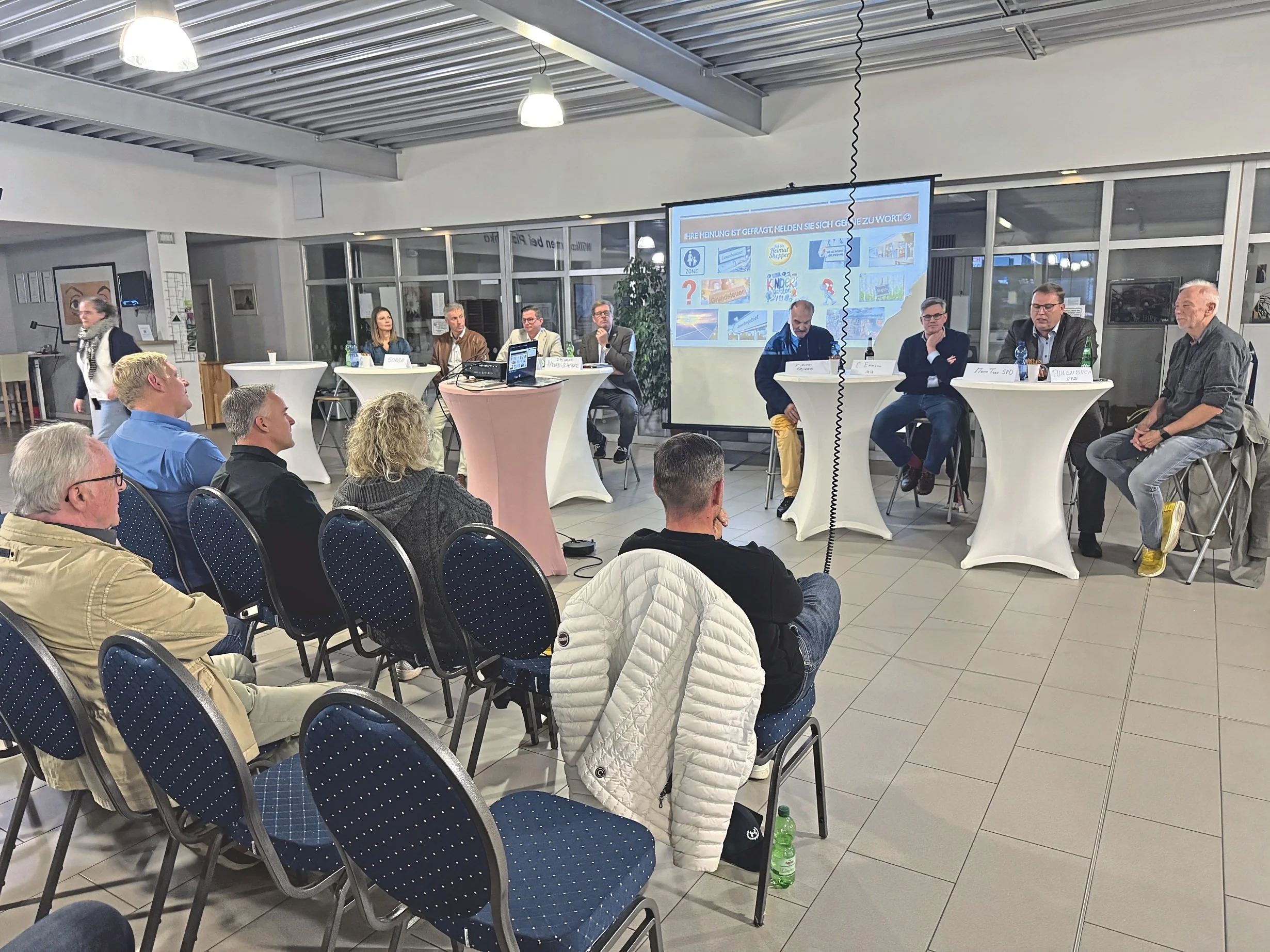 Hinter weißen Stehtischen stellen sich Stadtkämmerin Anna Adamczak (von links), Stefan Sorge (MU), René Buchterkirchen (CDU), Harved Scheiger (Grüne), Siegfried Irion (Gruppe FDP/WGM), Dr. Carsten Emmann (MU), Marco Tews und Michael Aulenbach (beide SPD) den Fragen der Gewerbetreibenden bei der Diskussion im Autohaus Plaschka. Foto: akü