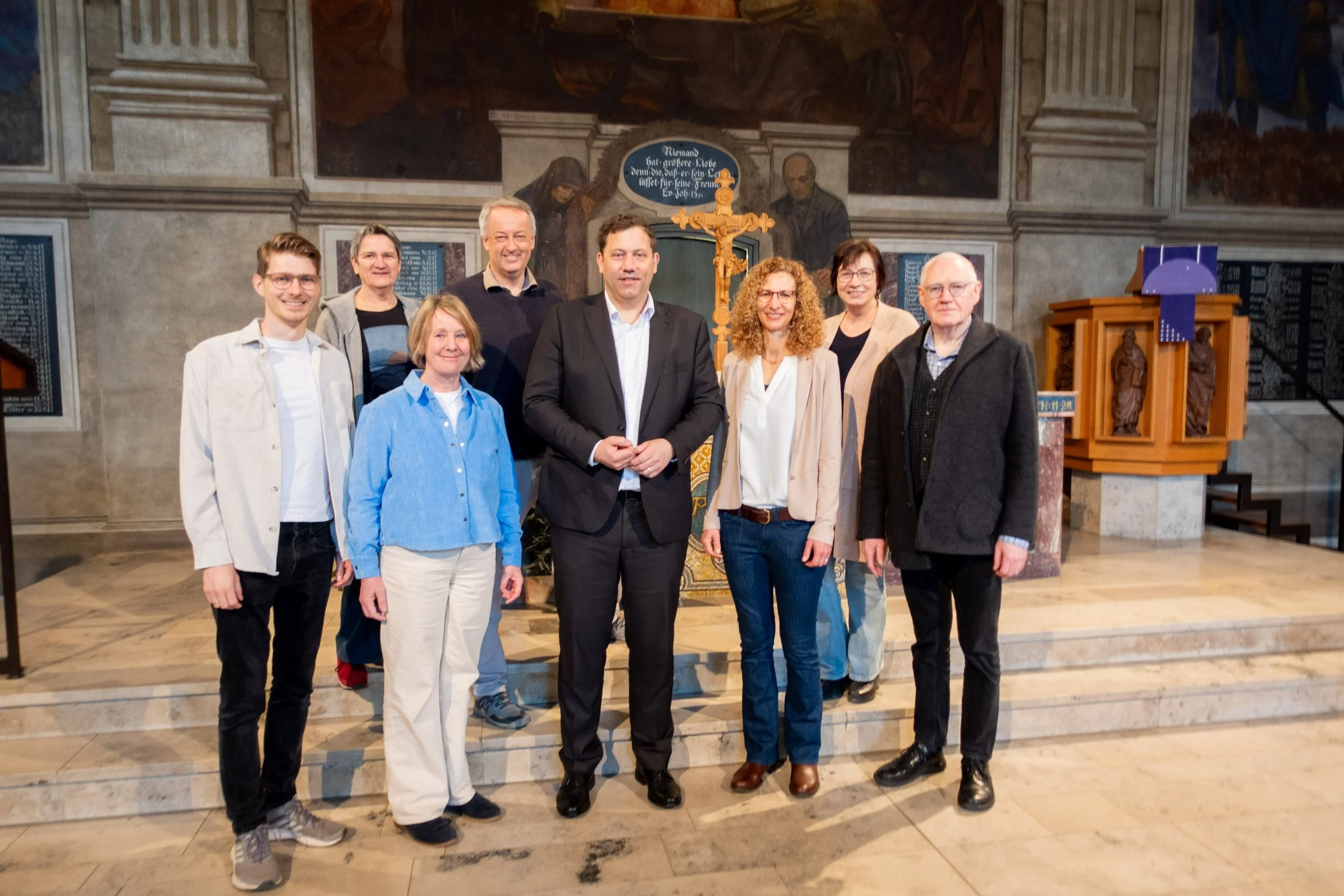Der Kirchenvorstand mit Pastor Johannes Döhling (links) und weitere Ehrenamtliche der St.-Johannis-Gemeinde freuen sich über politische Unterstützung für das Bauprojekt durch die Bundestagsabgeordneten Vivian Tauschwitz (CDU) und Lars Klingbeil (SPD, Mitte). Klingbeil war bereits vor einigen Jahren vor Ort und besuchte die Kirche am Sonnabend erneut. „Wir wollten uns für das Engagement bedanken“, so Kirchenvorstandsmitglied Dorothee von Felde (3. von links). Statt der geplanten 10 blieb der Vizekanzler rund 45 Minuten. Denn in der Kirche waren zudem zum Konfitag viele junge Leute: „Da war Leben in der Kirche.“